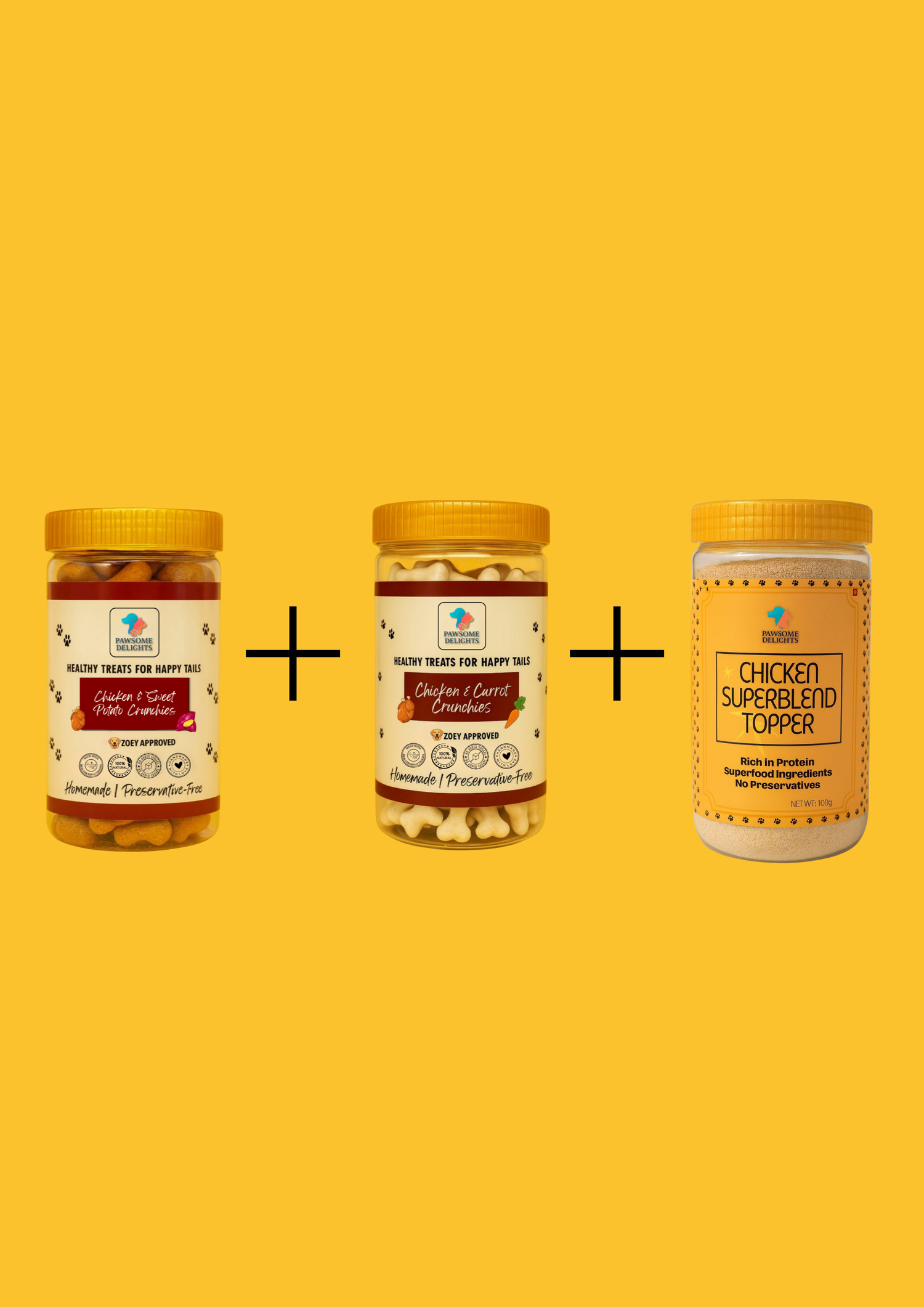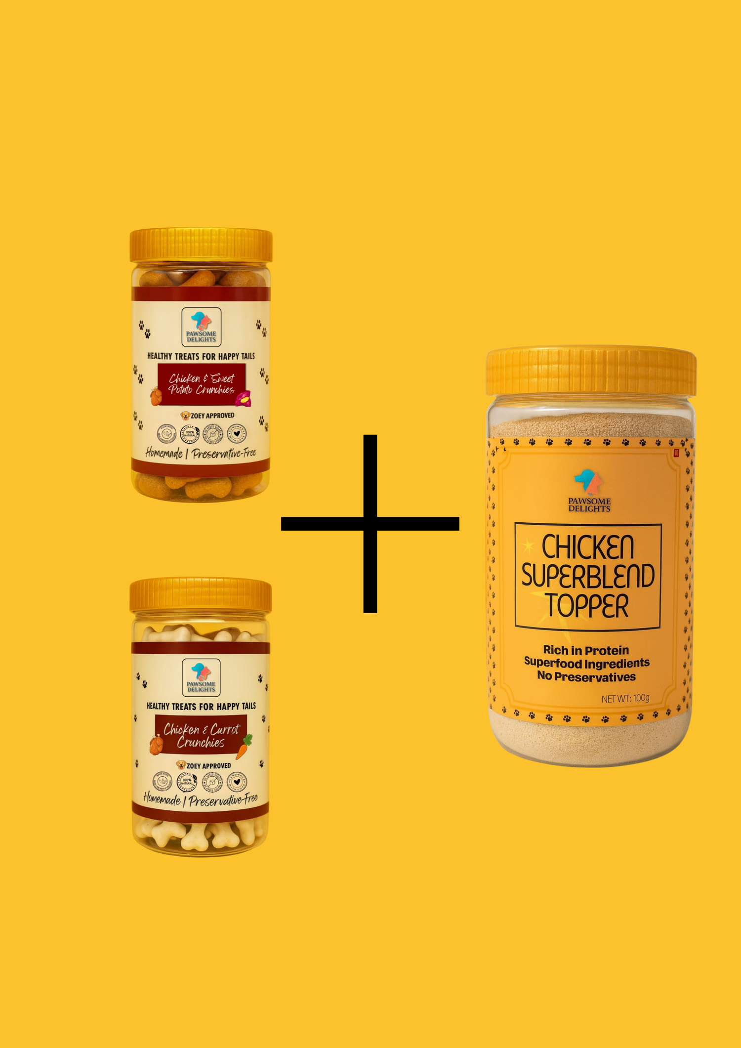 The ultimate health & happiness combo! Two flavours of our crunchy biscuits paired with our 100g Chicken Superblend Topper, packed with real chicken, flaxseed, parsley, turmeric & pumpkin. A complete treat + nutrition package for dogs who deserve the best.